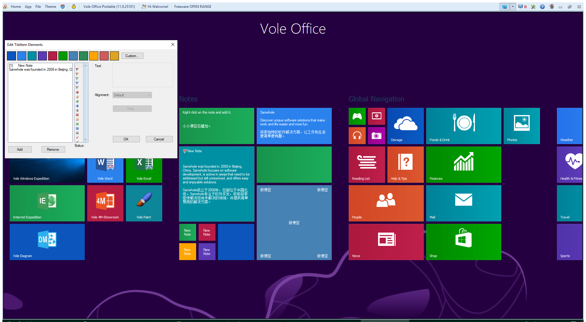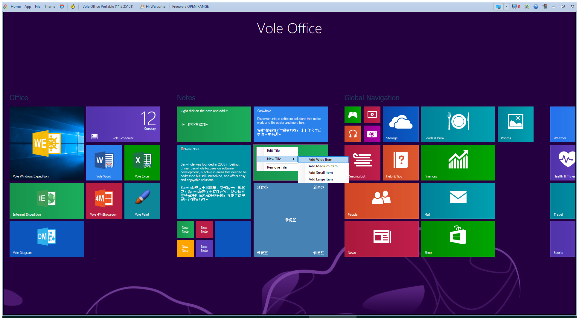 -取消Vole Paint。 +迁入2013就发布的Vole Internet Expedition 从 Sanwhole Studio. +布局保存,布局加载和启动自动加载布局。布局的保存加载和自动加载可以自定义软件启动时自动加载哪些软件和恢复软件显示布局。 +增加Vole Word, Vole Excel等所有软件支持自定义加载。自定义加载包括:不加载,加载一个和加载多个。 +增加软件停靠功能。软件既可以重叠显示也可以平铺显示或是重叠和平铺显示。 |